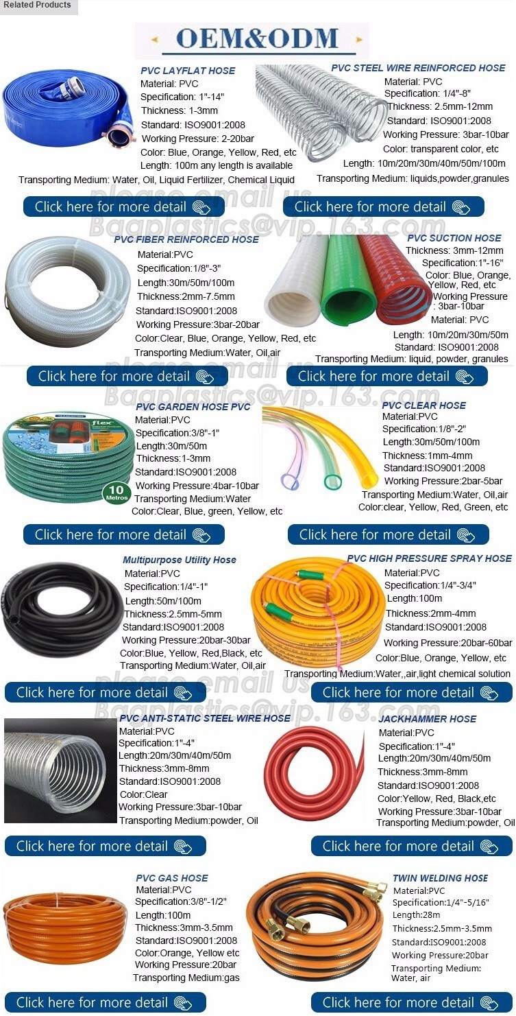 | PVC Layflat Hose: | PVC Steel Wire Reinforced Hose | PVC Fiber Reinforced Hose: | Garden Hose |